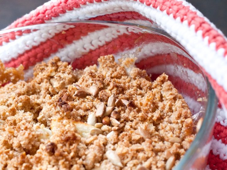 Ajouter éventuellement 2 c. à soupe d’amandes effilées, de noisettes ou de noix hachées ou de graines de tournesol ou de lin sur le crumble.