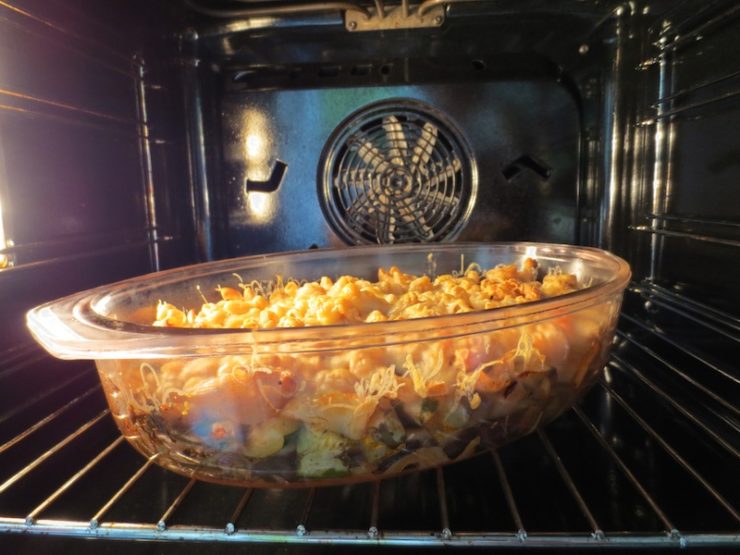 - Couvrir le fond d’un plat à gratin large d’une couche de pâtes, ajouter le mélange de légumes et recouvrir le tout d’une autre couche de pâtes.