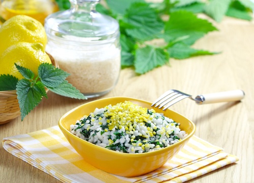 Le risotto aux orties accompagne accompagne le rôti de porc au lait dans notre livre Y a pas que le steak dans la vie