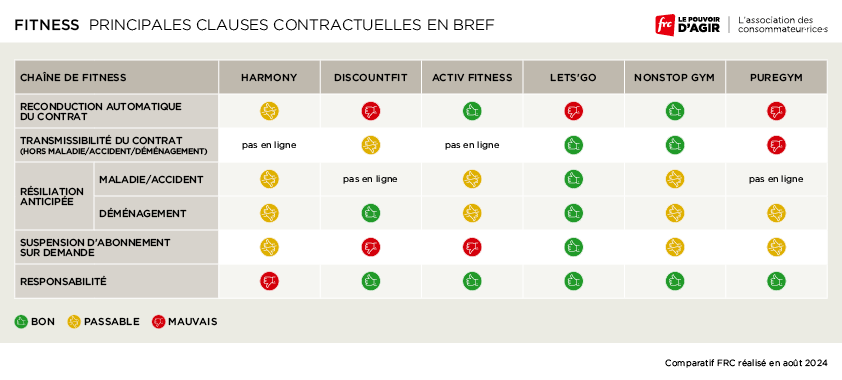 Les tableaux qui suivent prennent en compte les conditions générales telles qu’elles sont disponibles sur les sites internet des fitness Harmony, Discountfit, Activ Fitness, Let’s Go, NonStop Gym et Puregym (août 2024). Ces sociétés gèrent souvent plusieurs salles et sont présentes dans différents cantons. Les clubs qui ne mettent pas en ligne leurs conditions générales ont été exclues. Le tableau reprend cinq critères majeurs: la reconduction automatique du contrat, la possibilité de transmettre son abonnement à un tiers, la possibilité de résilier son abonnement en cas de maladie/accident ou de déménagement, la possibilité de suspendre son abonnement pendant une certaine période et la responsabilité du fitness en cas de blessure lors de l’utilisation des installations.