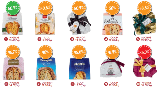 Et le trio de tête par contre? Il Gran Panettone de Maina (Migros), le Favorina Classico (Lidl) et le Classic de chez il Viaggiator Goloso (Manor). Le produit de Lidl est imbattable au niveau du prix… mais bien trop sucré. On préférera donc se tourner vers celui de Migros – ni trop sucré, ni trop gras et aux arômes naturels –, comme étant le bon compromis pour cet achat gourmand.