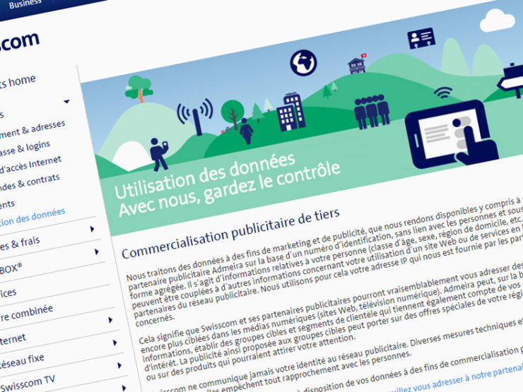 - Depuis juin 2017, vous pouvez également choisir, sur la base d’un « opt-in » de transmettre des informations beaucoup plus précises. Il s’agit du sexe, du groupe d’âge, de la région d’habitation, de la langue de correspondance, de l’état civil, de la taille du foyer, de l’approximation du pouvoir d’achat, de la manière de communiquer avec vous et, enfin, des préférences sur Swisscom TV (ce que vous regardez et quand, vos centres d’intérêts, etc). Précisons que ces données seront toujours agrégées et anonymisées.