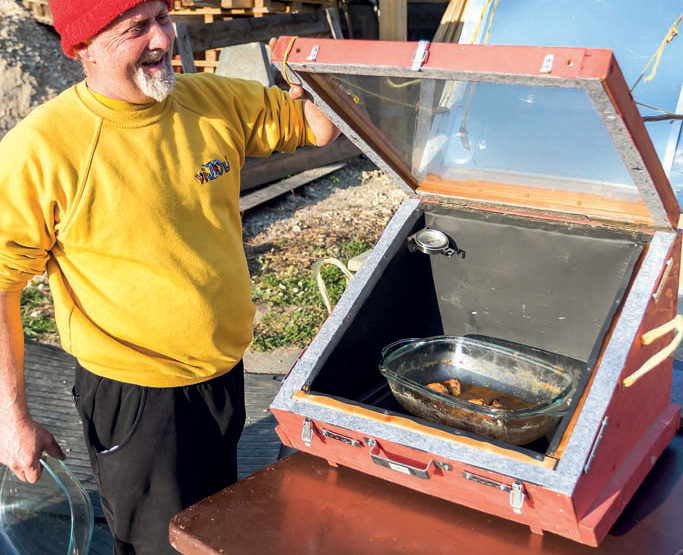 Elle est loin d’être discrète, la parabole trônant devant la maison de Denis Jolidon dans les hauts de Courtételle (JU). «Je l’appelle le cuiseur: une cuillère en bois avait brûlé, un pied en métal avait fondu. Et je ne vous parle pas de l’éblouissement. Mais en été, ça fonctionne vraiment bien!» On ne s’attardera pourtant pas plus sur ce modèle professionnel; passionné par la cuisine solaire, le bricoleur – clown de métier – l’avoue, il serait incapable de construire le même par ses propres moyens.