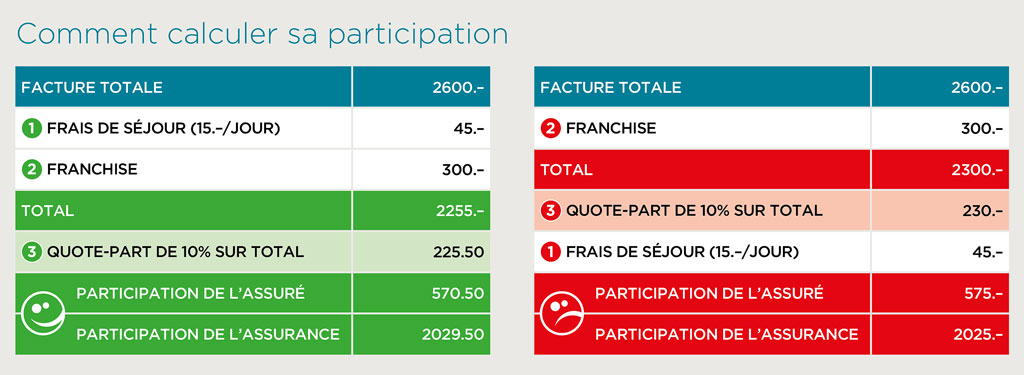 Prenons le cas fictif de M. Martin qui sort de l’hôpital. Il a opté pour un modèle d’assurance ordinaire et choisi de prendre une franchise de 300fr. Après un séjour de trois jours, sa facture s’élève au total à 2600fr. M. Martin n’avait eu recours jusque-là à aucune prestation médicale, il doit donc s’acquitter de sa franchise. La LAMal prévoit également qu’il participe au forfait de séjour journalier et à la quote-part de 10% (jusqu’à concurrence de 700fr.).