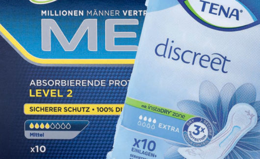 Technologie d’un côté, douceur de l’autre: les protections contre l’incontinence comme les couches pour petits dans une moindre mesure jouent à fond les stéréotypes féminins et masculins.