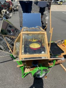 Parmi les stands, celui dédié aux matériaux de construction était utile pour tout néophyte intéressé à l’expérience: panneau réflecteur, laine, vitre, bois et, si possible, récipient noir. On y apprend aussi quelques règles d’or, comme incliner le four à 30 degrés en été et à 60 en hiver afin que le soleil puisse refléter le maximum de rayons. Évidemment, ce qui mijotait attirait aussi l’attention: pain maison, crumbles, légumes et même un gratin de pommes de terre.