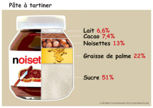 On préfère une tranche de pain frais au bon goût de chocolat et de noisettes? Outre le fait qu’une pâte à tartiner contient du sucre pour moitié, ses proportions en cacao et en fruits à coque sont moins importantes qu’en huile de palme! Une bombe calorique à réserver à des occasions rares. Pour en savoir plus sur l’huile de palme, un produit bon marché riche en acides gras saturés, consultez notre dossier.
