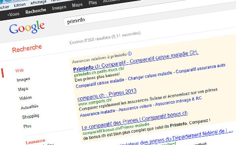 Il y a quelques jours, taper « priminfo » dans le moteur de recherche Google aboutissait à une drôle de surprise: en tête des résultats, parmi les liens sponsorisés (ou liens commerciaux), apparaissait un site intitulé Priminfo.ch Comparatif (voir la capture d’écran).