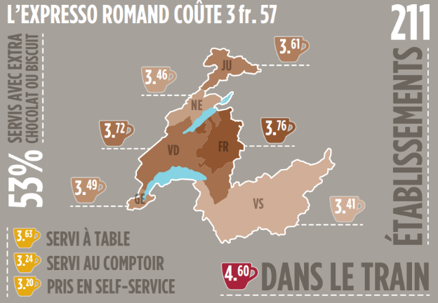 La moyenne globale pour cette boisson s’élevait en 2017 à 4 fr. 24, un chiffre en hausse constante. Berne, le canton le plus à l’ouest des régions alémaniques, se situant en dessous de la fourchette, à 4 fr. la tasse, cela permettait de supposer que le prix en Suisse romande était probablement plus bas qu’ailleurs. Mais il ne s’agissait que d’une extrapolation.
