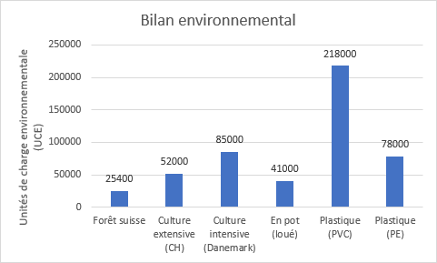 Vient ensuite le sapin suisse de culture extensive, c’est-à-dire peu traité, qui se dispute la deuxième place avec celui en pot, loué pour les fêtes. Le bilan des arbres importés est en revanche mauvais, car ils proviennent de pépinières exploitées de manière intensive à grand renfort d’engrais et de pesticides, ce qui rend leur bilan encore pire que celui d’un sapin en PE.