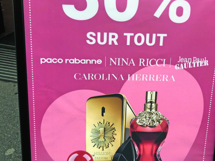«Je suis tombé sur un panneau publicitaire devant le magasin Import Parfumerie qui indiquait la chose suivante: «30% SUR TOUT».»
