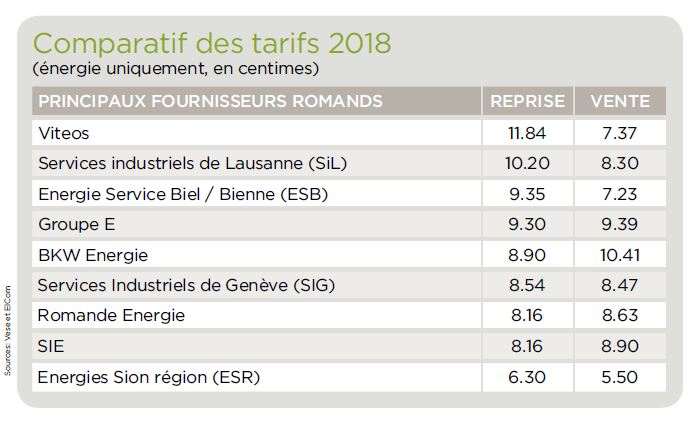 Un producteur qui injecte son courant dans le réseau de Neuchâtel recevra ainsi 11,84 ct. par kilowattheure de la part de Viteos, mais seulement 6,3 ct. à Sion de ESR. Ceci alors que l’électricité achetée auprès des mêmes fournisseurs – pour couvrir sa consommation lorsque les panneaux ne produisent pas – sera facturée respectivement 21,69 ct. et 14,86 ct./kWh.