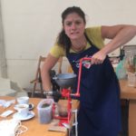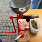 Sur le stand, les enfants ont découvert comment fabriquer une huile à froid. L’idée était aussi de présenter une denrée «faite main» avec un produit du terroir sans aucun apport de chaleur extérieure. Transformer du colza est tout un art: une petite poignée de graines – locales, bio et achetées en vrac –versée dans l’entonnoir à l’entrée du moulin, une ambitieuse poussée de la poignée à deux mains (!) pour tourner la visse et écraser les graines, une petite flamme de bougie pour faciliter l’extraction de l’huile, et voilà une petite goutte dorée qui tombe…