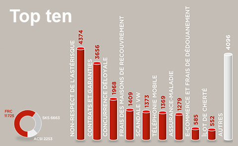 La liste des doléances – un total de plus de 20 600 pour l’ensemble du pays – répertorie les dix domaines pour lesquels les Helvètes ont fait appel aux services Conseil des trois organisations de défense des consommateurs: FRC (11725), SKS (6663) et ACSI (2253).