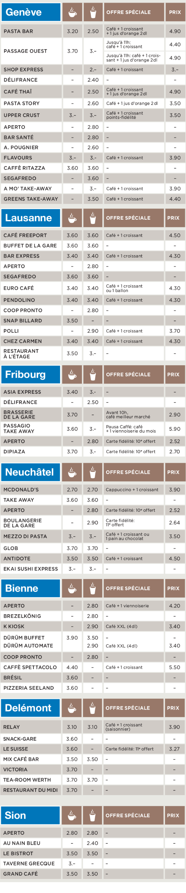 Résultats: côté prix, les Romands sont généralement mieux lotis que les Alémaniques, chez qui, selon l’association Cafetier Suisse, le prix moyen du café crème avoisine cette année les 4 fr. 04. Dans les gares romandes, la moyenne des tarifs des boissons à consommer sur place se situe autour des 3 fr. 54, avec un pic au Caffè Spettacolo de Bienne (4 fr. 40), le moins onéreux étant le McDonald’s de Neuchâtel (2 fr. 70).