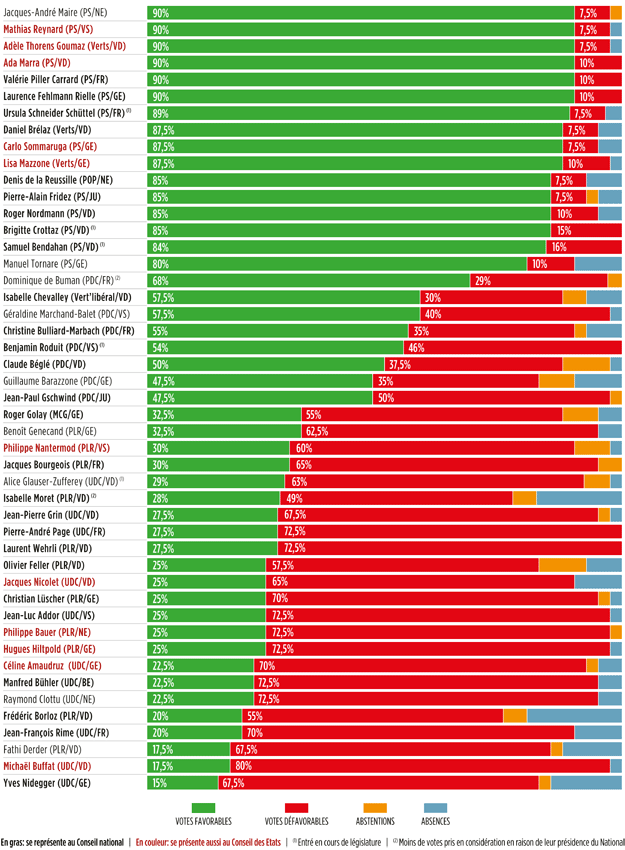 Les 48 parlementaires romands ont été classés individuellement, du meilleur au pire score. Les élus qui comptent 80% et plus de votes pro-consommateurs entrent dans la catégorie des ardents défenseurs. Suit le coprésident de l’Intergroupe (68%), considéré comme bon défenseur. Ceux qui ont obtenu un score supérieur à 33% auraient pu mieux faire. En deçà, les députés ont été mis sur la touche.