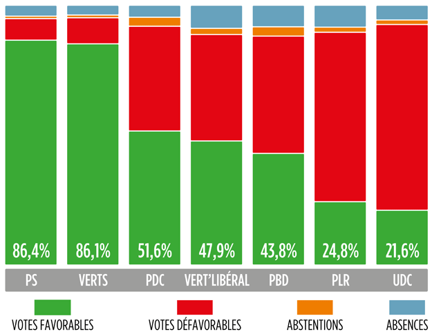 Considérant les partis, les socialistes et les Verts se situent dans un mouchoir de poche, avec respectivement 86,4% et 86,1% de votes favorables. Avec un score global de 24,8% au sein du PLR, on note toutefois des différences importantes selon les personnalités. Ainsi, l’écart entre Isabelle Moret (VD) et ses colistiers Laurent Wehrli (VD), Hugues Hiltpold (GE) et Philippe Bauer (NE) est important, l’élue vaudoise votant nettement moins en défaveur du consommateur. L’UDC ferme la marche avec seulement 21,6% d’intentions favorables.