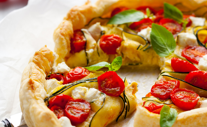 - Tailler les courgettes au couteau économe en longues lanières et répartir en chiffonnade sur la farce. Couper les tomates en deux, émietter la féta et en garnir la quiche.