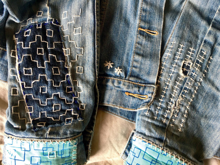 Stéphanie Jaquet a expérimenté la technique sur sa vieille veste fétiche en jeans. Après avoir couvert les trous d’usure avec des points en croisillon, elle a orné une manche de broderies plus élaborées, purement esthétiques, avant d’embellir les bords des manches et la boutonnière qui s’effilochaient. «J’apprécie le côté très graphique du sashiko, explique la Genevoise de 47 ans. Je porte cette veste tout le temps. Elle me fait sourire.» Le nombre d’heures passés à rapiécer? Elle ne les a pas comptabilisées. «Je n’en tiens pas compte. J’estime que c’est un passe-temps agréable avant tout.» Stéphanie a aussi utilisé des points de sashiko pour deux shorts. La prochaine mission: s’attaquer à une chemise de son mari. Fera-t-elle des émules?