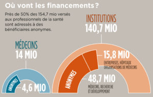 Pour remédier à la situation, le bimensuel Beobachter, en collaboration avec le SKS, membre de l’Alliance des consommateurs à l’instar de la FRC, et le centre de recherche allemand Correctiv, a établi une base de données regroupant les informations publiées par les pharmas. Certes, cette page web – en allemand mais accessible depuis frc.ch –, contribue à davantage de transparence. Mais il reste des obstacles. Tous les bénéficiaires de ces versements n’acceptent pas de figurer sur la liste ou le sont de manière anonyme. A peine la moitié des récipiendaires sont recensés et il n’est pas aisé de connaître l’utilisation exacte des fonds perçus.
